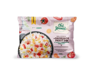 Рис, морковь резаная, перец сладкий резаный, томаты резаные. Соус: масло подсолнечное рафинированное дезодорированное, масло сливочное, вода,соль, эмульгаторы (моно- и диглицериды жирных кислот, соевый лецитин), куркума, чеснок сушеный, зелень кинзы сушеная.